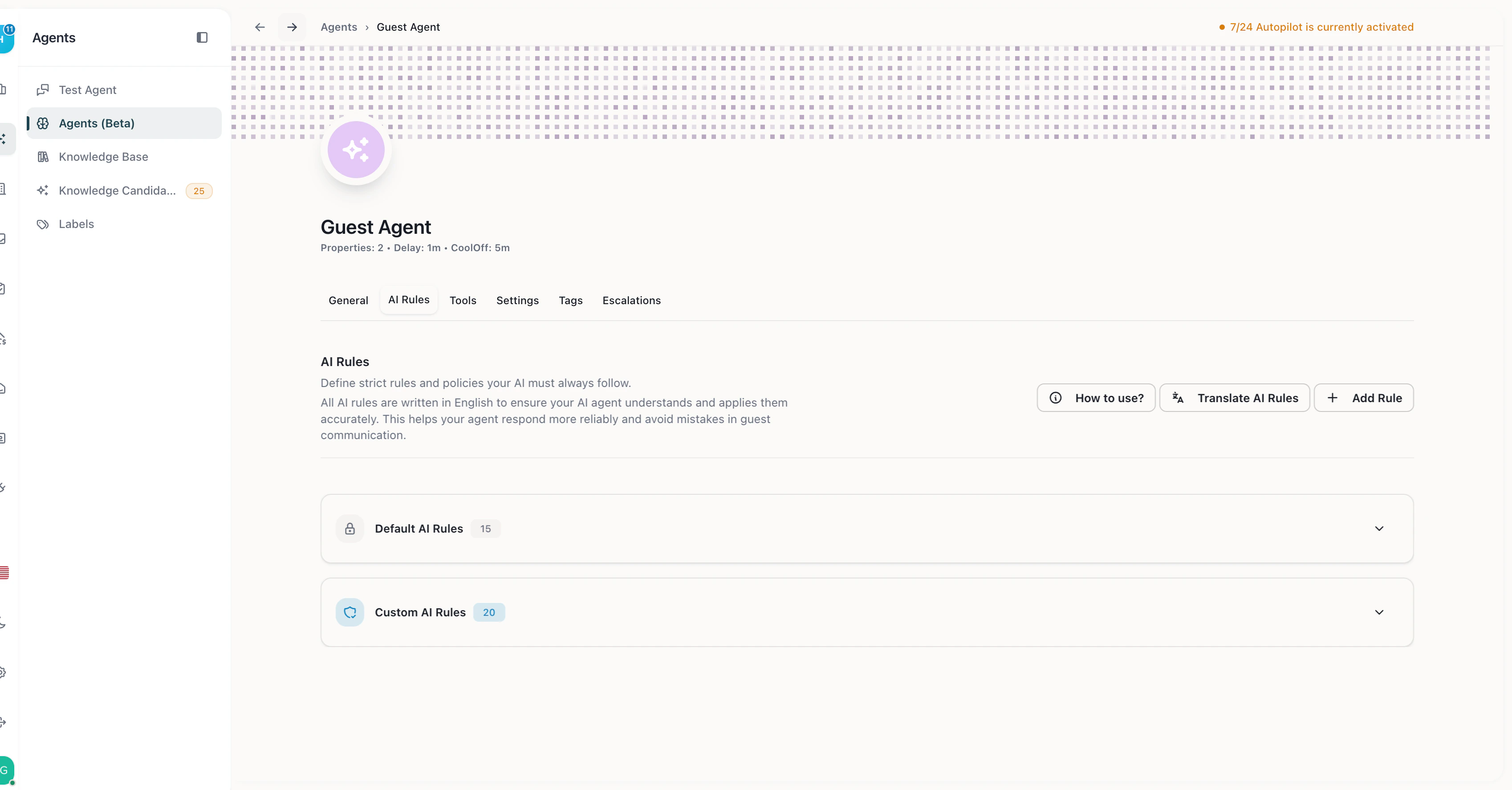 AI Rules can be restricted to specific labels, making them apply only when certain conditions are met. For example:- A rule that only activates for VIP guests (labeled “VIP”)